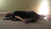 Lie on your back with your calves and feet supported by the bolster and/or blocks and blankets. Legs can cross in Lotus, resting knees on bolster. Knees should be at a 90 degree angle. Place a blanket across the pelvis to help release tension and assist that area in feeling grounded. Rest arms by your side or in Goddess, as shown in photo, palms facing up or down. If facing up, place weighted eye pillow or small stuffed animals in the open palms to encourage relaxation. Place a folded blanket under your head and neck roll at cervical spine. If shoulders do not rest on the floor, place a blanket there to allow shoulders to feel comfortable and not like your are holding them up. A blanket may be placed in the lumbar curve for comfort.