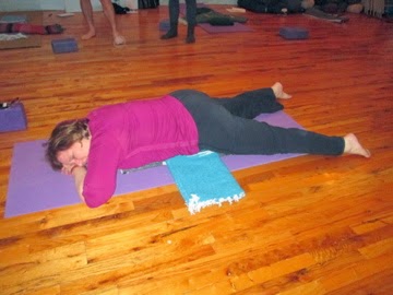 Lay one blanket vertically on your mat and another blanket horizontally on top of the first blanket. Come to your belly on the floor so that the pelvis is supported by the top blanket and the chest is supported by the bottom blanket, shoulders can hang off. Open legs wider, relax the pelvis into the floor. Make a pillow with hands or forearms and rest your head. Great transitional pose. Rest for 5 minutes or more.