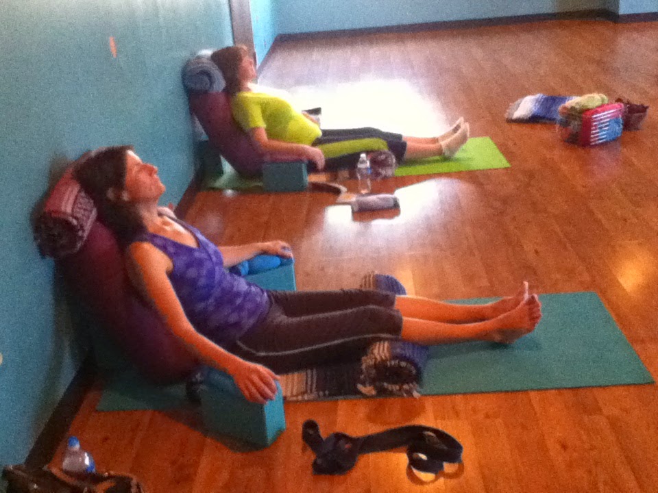 Stack one or two blankets to the side folded in half. As you release to the floor, lengthen the body and then bend the leg at 90 degree angles to lay on the blankets to the side. Arms can come to goddess position, head turned to the side or stack hands as a pillow. For those with tight shoulders, extend arms by the sides of the body. When you need to turn the head, do so with a soft inhalation.