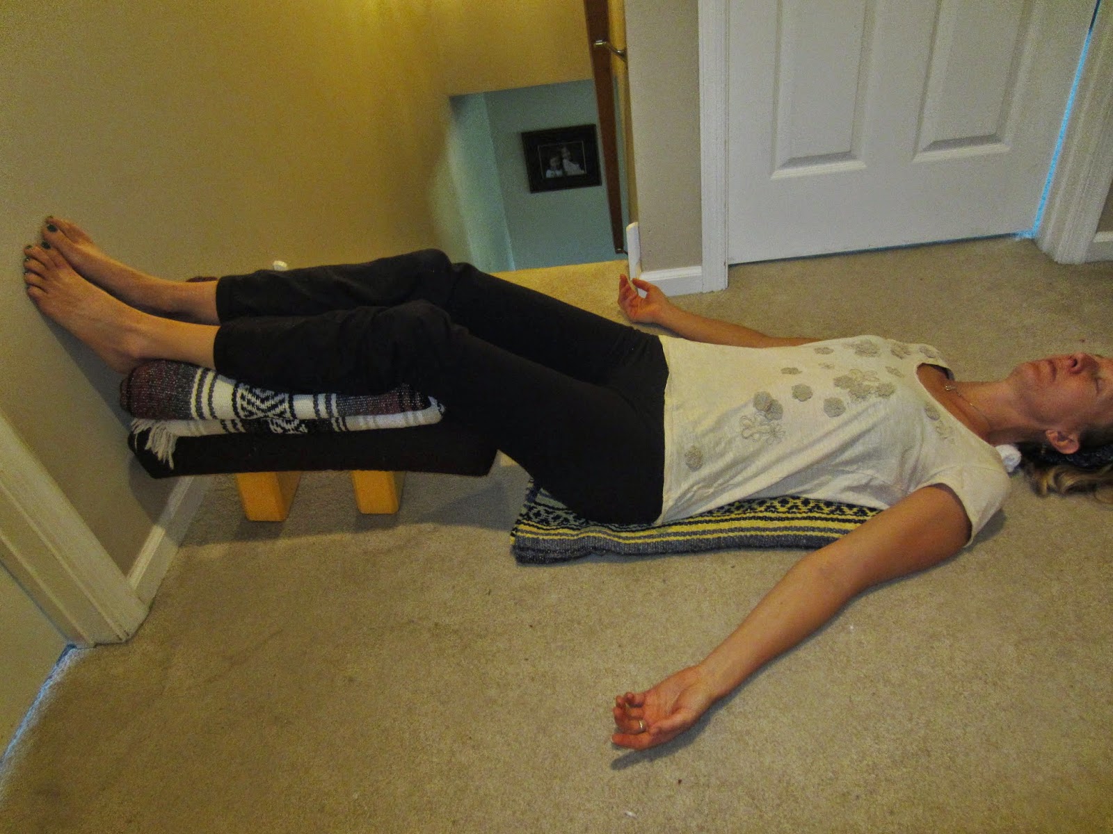 The photo demonstrates Legs Up version with two blocks placed under the bolster. Another variation is to keep the Reclined Bound Angle set-up as above and lay the legs on the bolster at that angle. Legs will be at more of an incline. Use as many blankets as you need to ensure that your low back is comfortable.