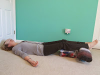 Make two stacks of blankets on your mat and place the two blocks at the edge of these stacks. Lay a folded over blanket over the blocks. Additional blanket may be needed for your low back. Lie down on the mat or floor and place lower legs on the stack of blankets and ankles and feet on the block supports. Keep legs in tadasana alignment for better blood flow. Add your neck roll and eye pillow, arms relaxed by your side.