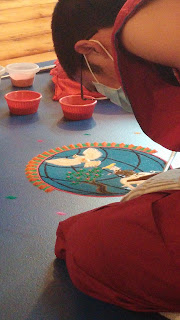 Speaking of Tibetan monks, the buzz at Moyo all this week, is monks, monks, monks. These kind, compassionate, down to earth individuals have been at Moyo since Monday and are creating an Interfaith Mandala. I will include some recent photos but if you have the chance to stop by and see it for yourself, it is so worth it. We’ve had numerous visitors both old and young come to the studio between 10:30 a.m. – 4:30 p.m. and then again in the evening. Sunday is the Dissolution ceremony,