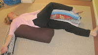 This can be a very prop intensive pose but once you are in it, it is worth it. Begin with right side of body, place the bottom of your right foot against the wall with leg extended. Left leg is bent at a 90 deg. angle and propped up with two blocks and a bolster with maybe a blanket on top. at least two blankets, S-fold blankets, and/or pillows placed along spine for support, lengthwise. Extend your left arm out to the left side and lay it on a smaller stack of blankets either s-fold or triple-fold out to your side. Right arm extends out to the right. This means the left arm is at a higher elevation than right. Head can remain neutral to ceiling or turn to one side. Extra blankets can be placed in spaces that need more support. Neck roll for cervical spine and eye pillow.