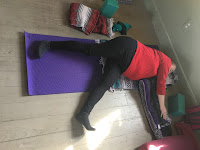 Place one blanket on the mat to cushion the lower hip and one folded blanket for head rest (keeping spine aligned). Lower down to your side, extending the top leg down the mat with the foot on the floor and the lower leg out to the side with foot to the floor. Arms can rest on top of each other while the head rest on the blanket. May add another blanket or pillow between arms. Stay for up to 5 minutes on each side, maybe rolling onto your back to bring legs to the body between sides.