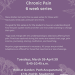 Yoga tools merge with this understanding to alleviate suffering from pain. Practices explored during this series are seated chair yoga, pain science, journaling, sharing, meditation, and breathing.