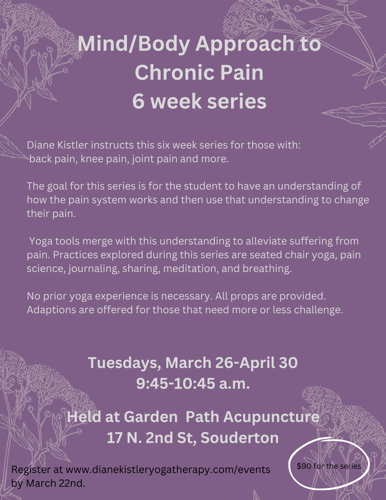 Register at Registration Mind/Body Series $90. Pay via Venmo (@Diane-Kistler) or by Zelle (2676648105) in advance or day of class.